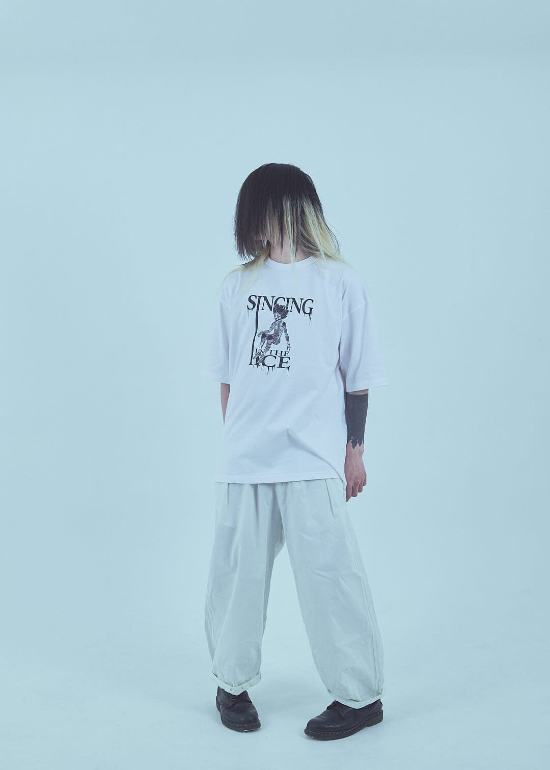一般的なTシャツのサイズよりも身幅が広く、肩が落ちるオーバーサイズなシルエットの作りをしています。